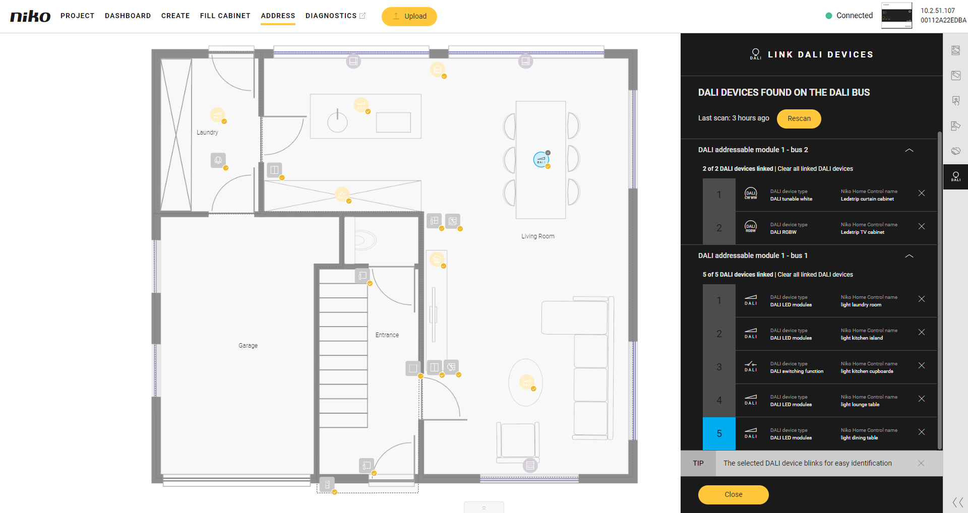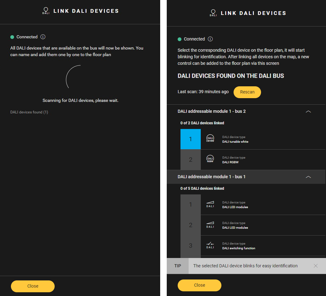 The Link DALI devices pane appears.If the DALI bus has not been scanned before, it is automatically scanned for DALI devices. If it has been scanned before, click the Rescan button to perform a new scan.